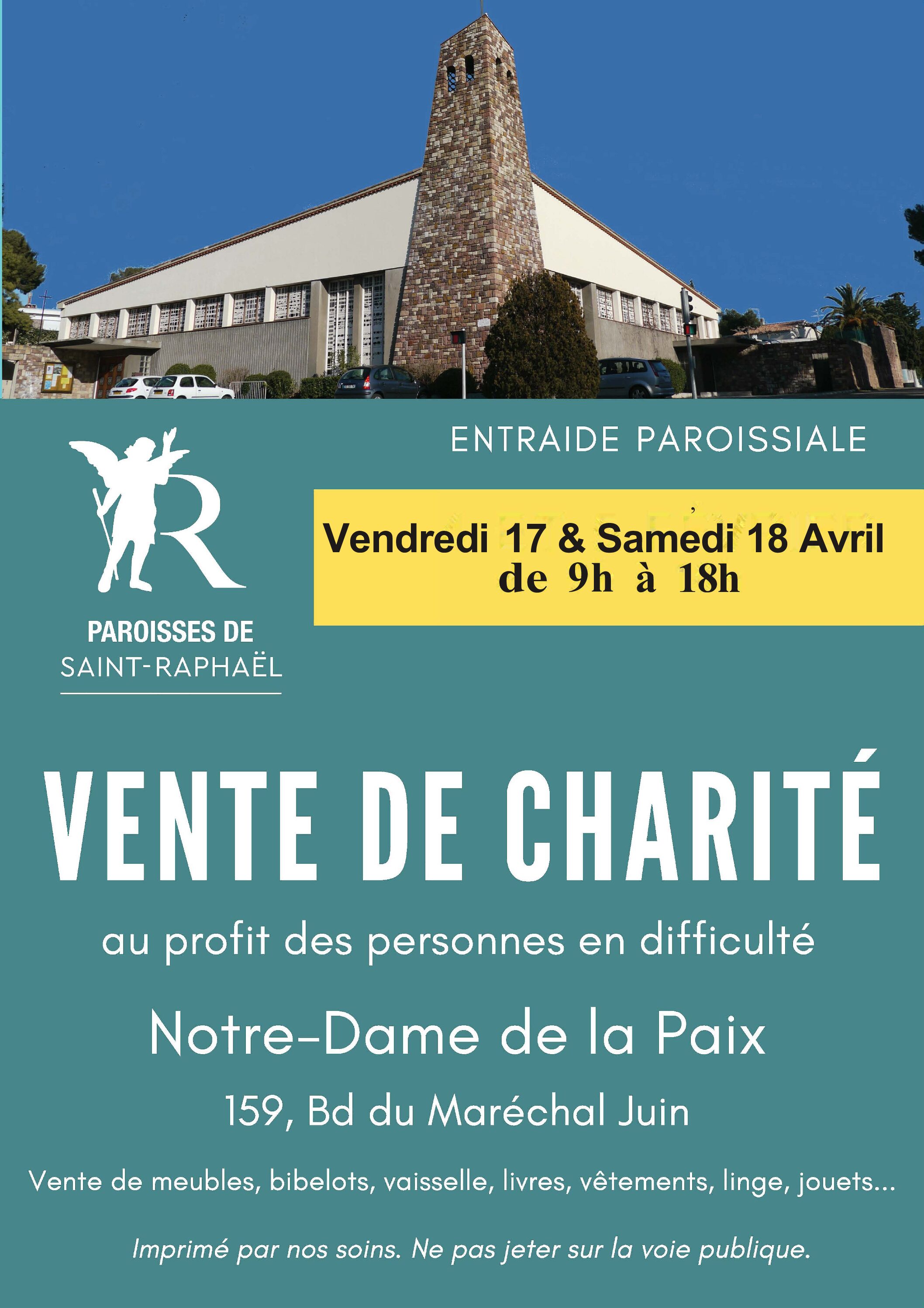 lire plusVendredi 17 et samedi 18 avril de 9h à 18hEglise Notre-Dame de la Paix159, Bd Maréchal Juin – Saint RaphaëlVente de meubles, bibelots, vaisselle, vêtements, lingede maison, chaussures, maroquinerie, livres, jouets, tableaux, électroménager, hi-fi, vinyles, CD, DVD….